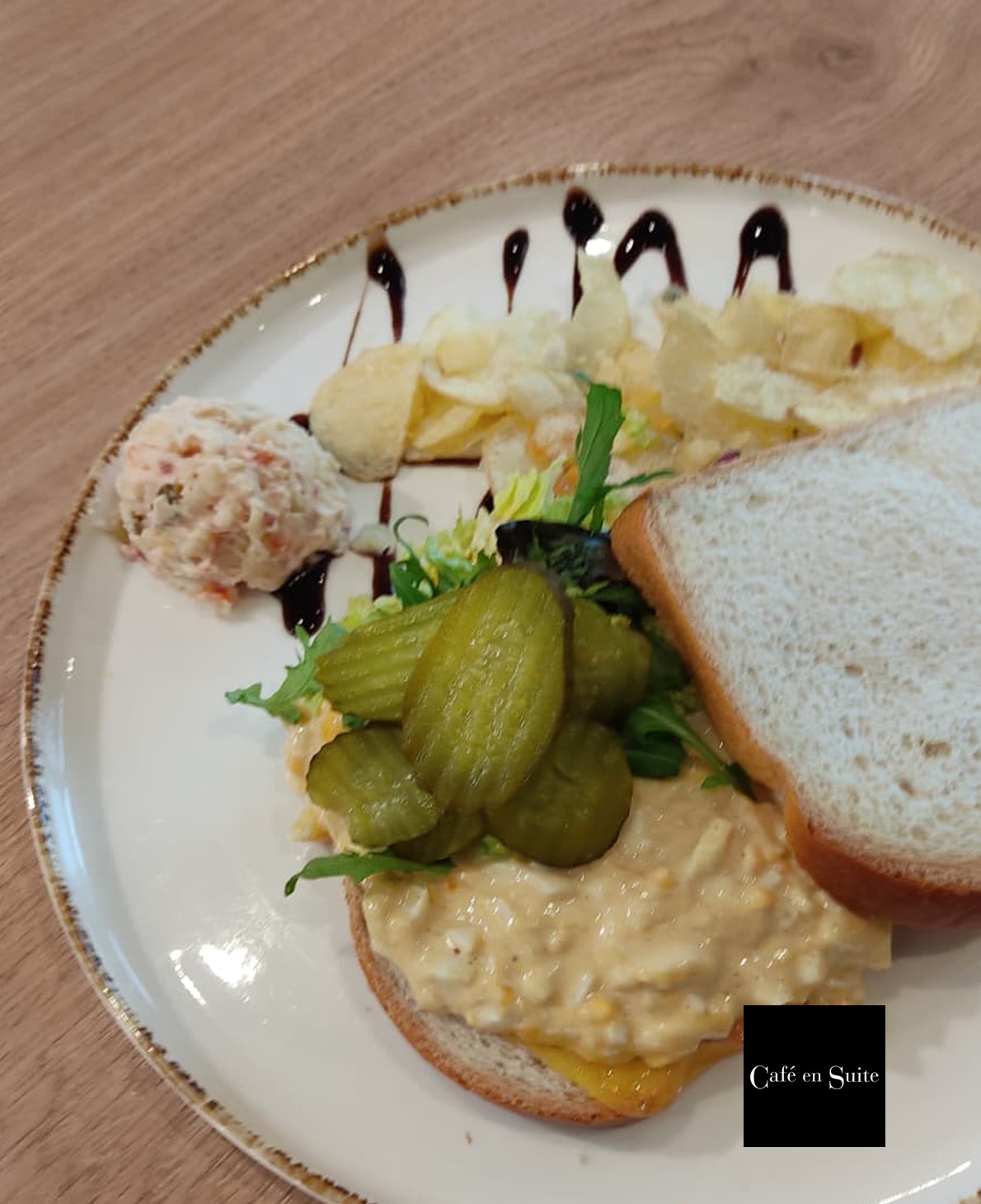 met boerenkaas en pestomayonaise, geserveerd met rauwkost en tomaat